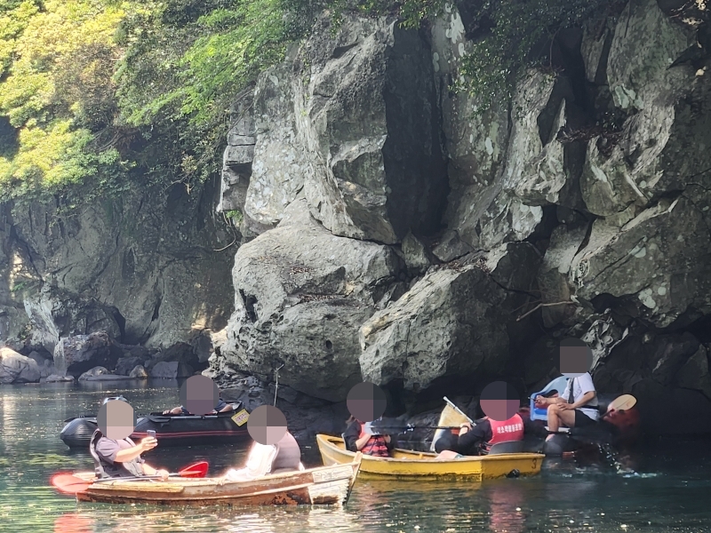 좀 더 가까이서 자세히 보고 싶었지만, 계곡 근처의 수심이 낮기 때문에 테우로는 가까이 접근할 수 없어 멀리서 사진만 찍었습니다. 테우가 아닌 카약을 타시면 조금 더 가까이 접근하실 수 있으니 참고하시기 바랍니다.