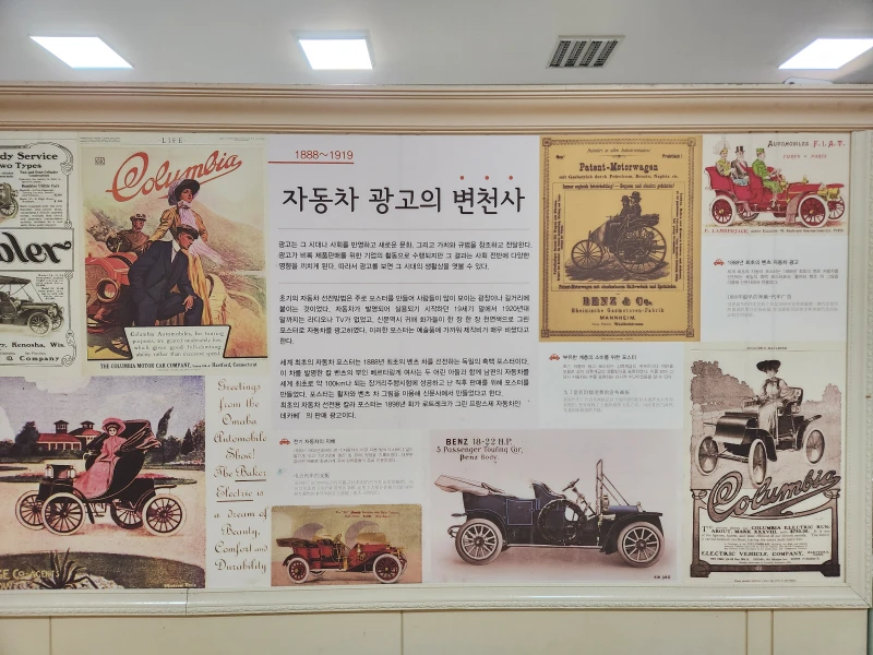 자동차와 자동차 광고의 변천사가 벽화처럼 게시되어 역사의 흐름을 따라가는 것처럼 관람하실 수 있고요. 각 시대에 맞는 자동차들이 설명과 함께 모형으로 전시되어 있어 이해하기도 쉬웠어요.