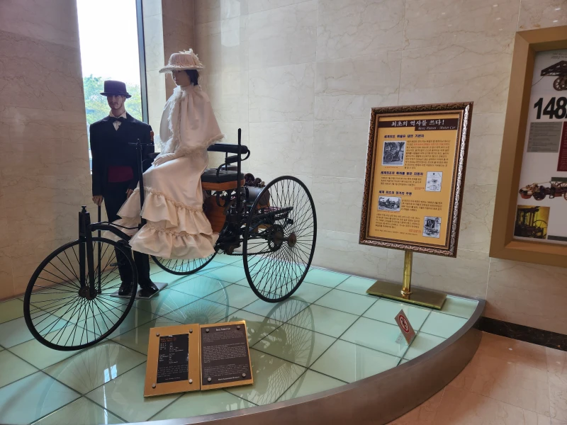 그리고 입구 홀의 구석에는 세계 최초의 자동차도 전시되어 있는데요. 얼핏 보면 마차 같기도 하고 자전거 같기도 하지만 엄연히 내연기관이 달려있는 자동차랍니다.