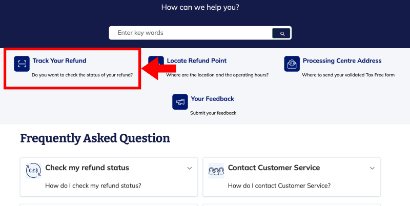 Global Blue 고객지원 페이지 접속 → Track your Refund → 여권 스캔 → 진행 과정 확인 (OR) 환급 추적기 이동 → Doc-ID 및 구매 금액 입력 또는 영수증 스캔 → 진행 과정 확인
